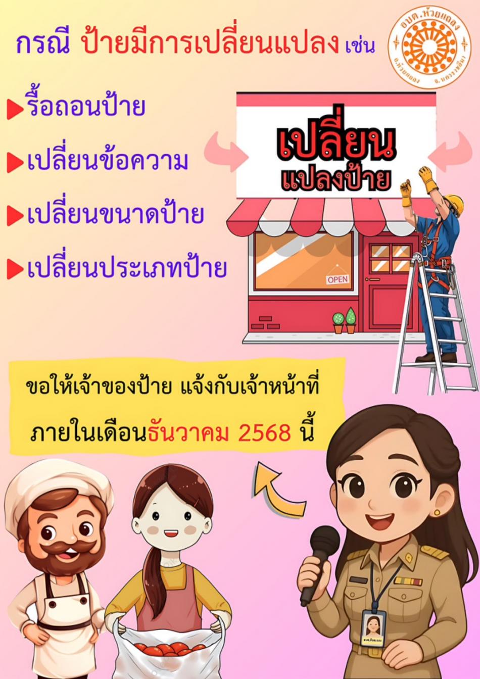 ประชาสัมพันธ์ กรณีป้ายมีการเปลี่ยนแปลง ขอให้เจ้าของป้ายแจ้งเจ้าหน้าที่ภายในเดือนธันวาคม 2568 นี้